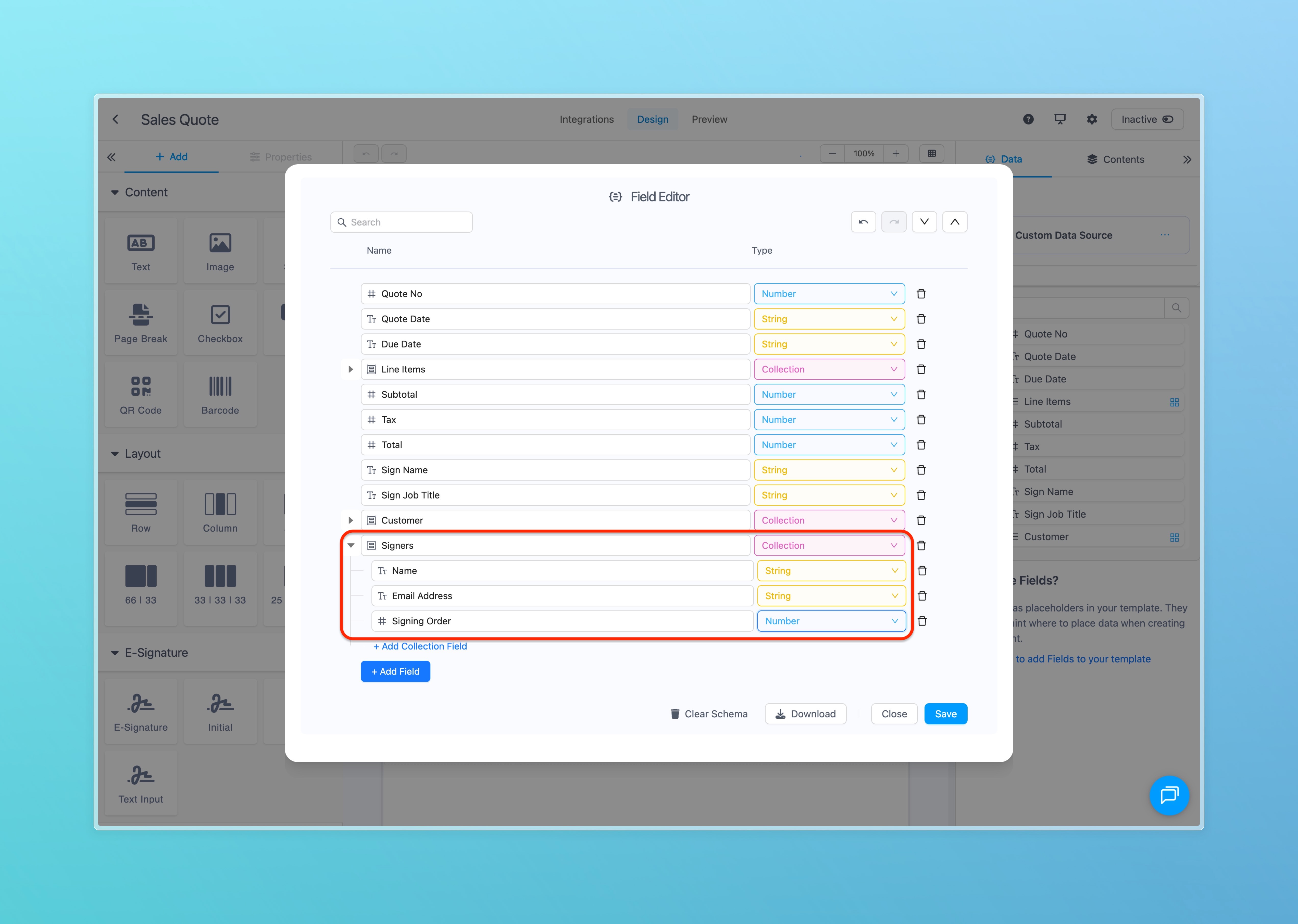 Signer information will need to be included with the data sent to Documint when creating a document. As such, we'll need to add a Collection Field (list of objects) that has at least 2 child properties, one that will contain the signer's email address and one that will contain the signer's name. &#x20;