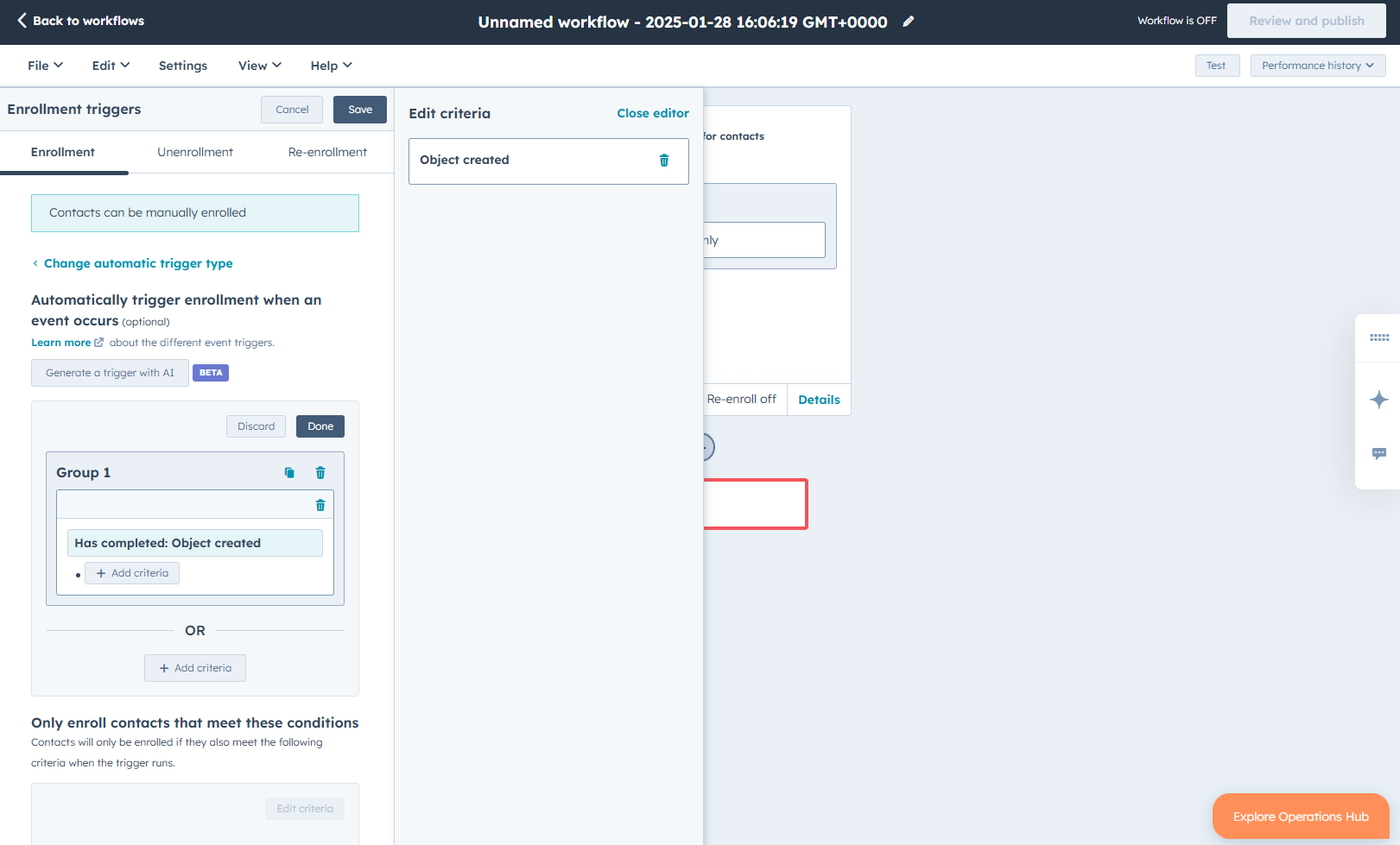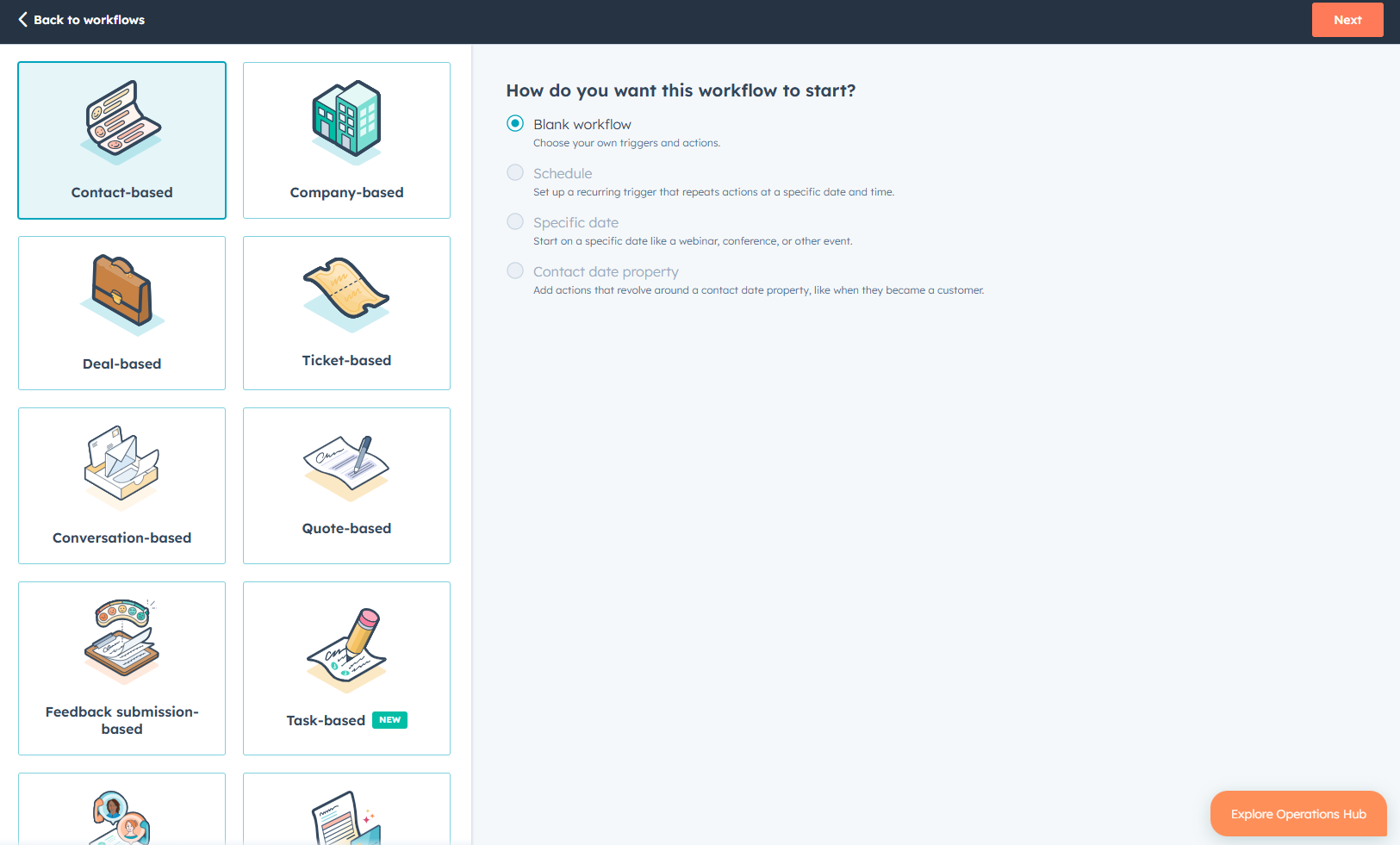 Go to the HubSpot workflow area and create a workflow that is either contact, company, deal, or ticket based.