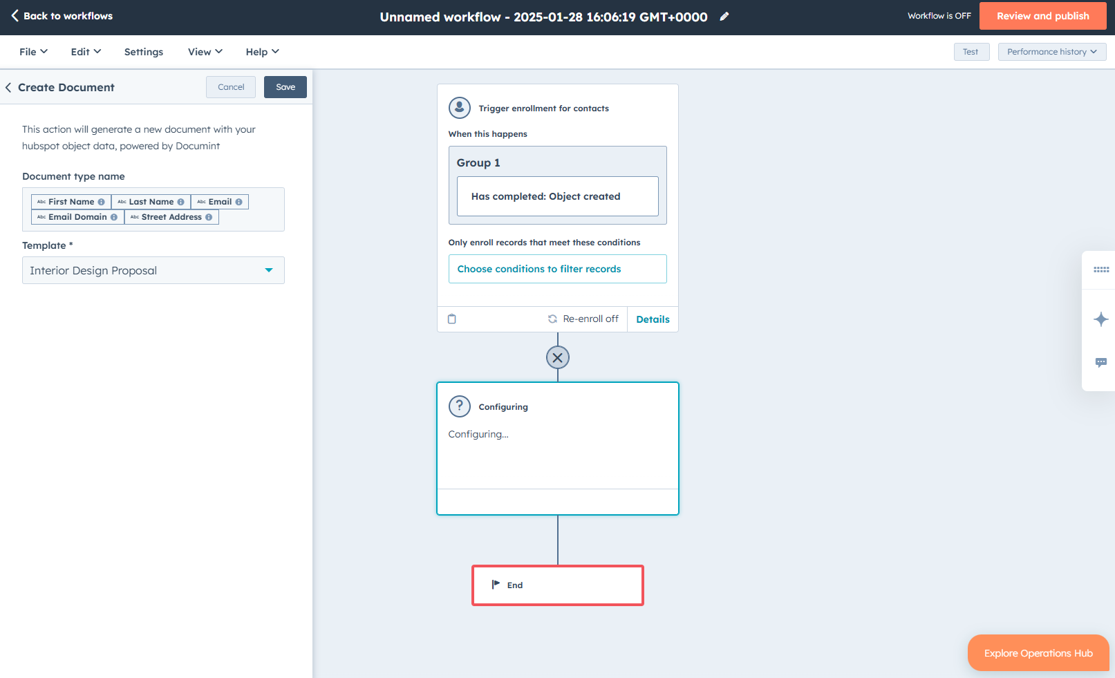 When you add an action, you will see the Documint custom workflow action. In the action you will select the template you want to use as well as the properties you want to send to populate the document (e.g. 'firstname', 'email', 'domain', etc.).